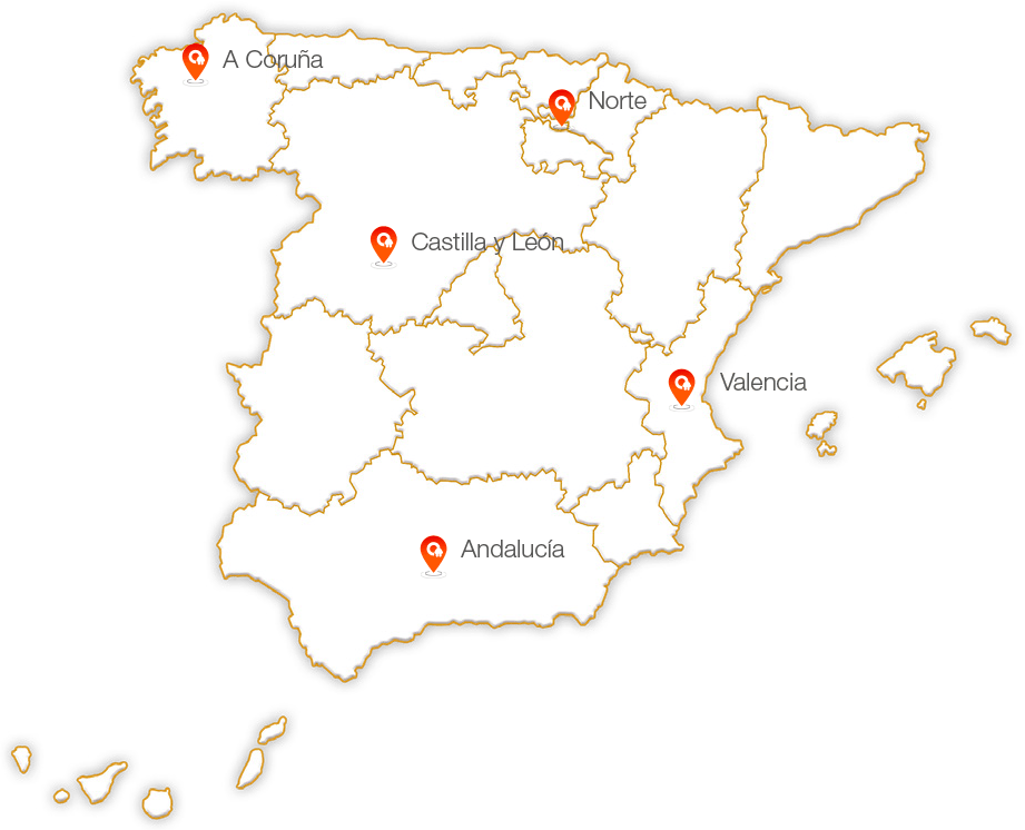 Estamos presentes en toda España a través de nuestras delegaciones en Andalucía, Castilla y León, A Coruña, Norte y Valencia.